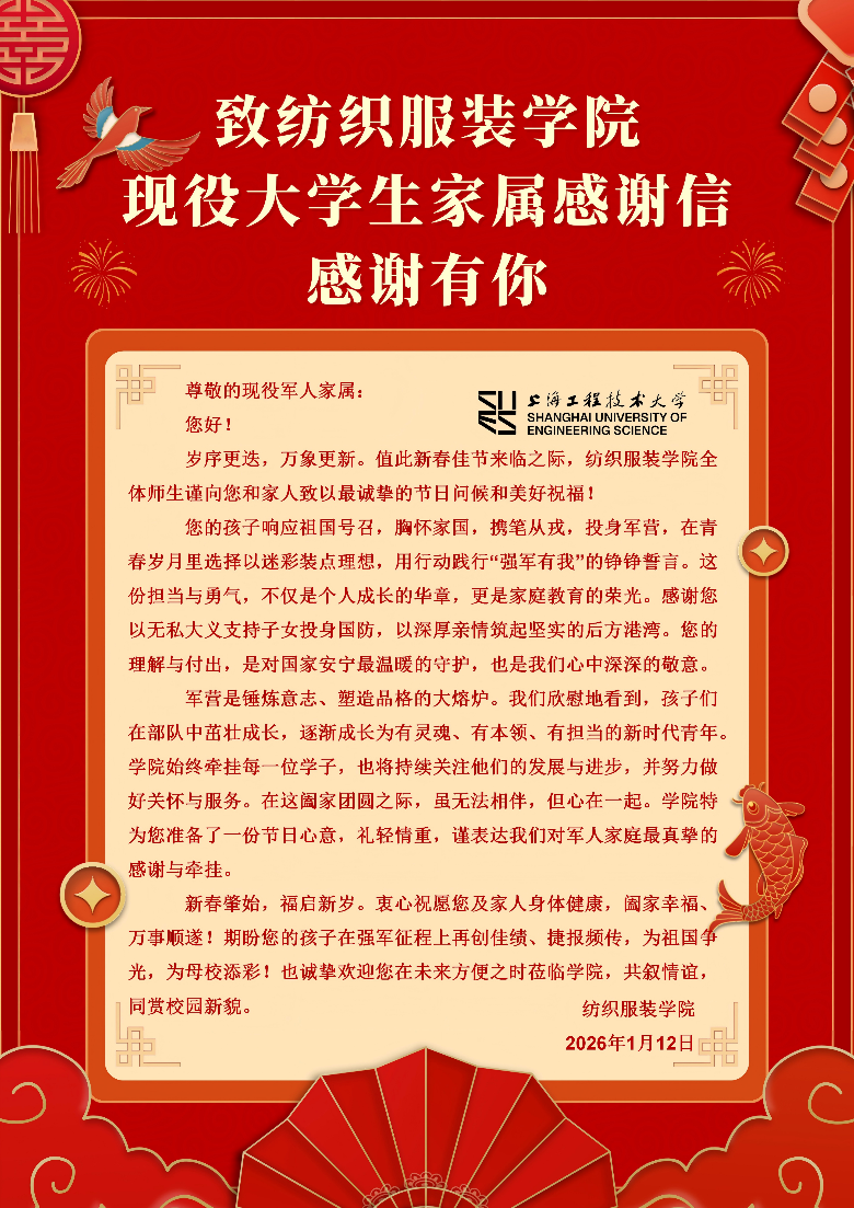 在春节来临之际,学院负责老师逐一与现役学生家长沟通,细致了解学生在部队的训练成效、生活冷暖,传递学院的牵挂与新春期许;同时,通过邮寄等方式为服役家属送上新春慰问信、节日慰问品,将学校与学院的深情关怀精准送到每一户军属。学生家属纷纷对学院的贴心举措表示感谢,承诺将一如既往支持子女安心服役、勇担使命,以优异表现回馈学院与社会的关爱。