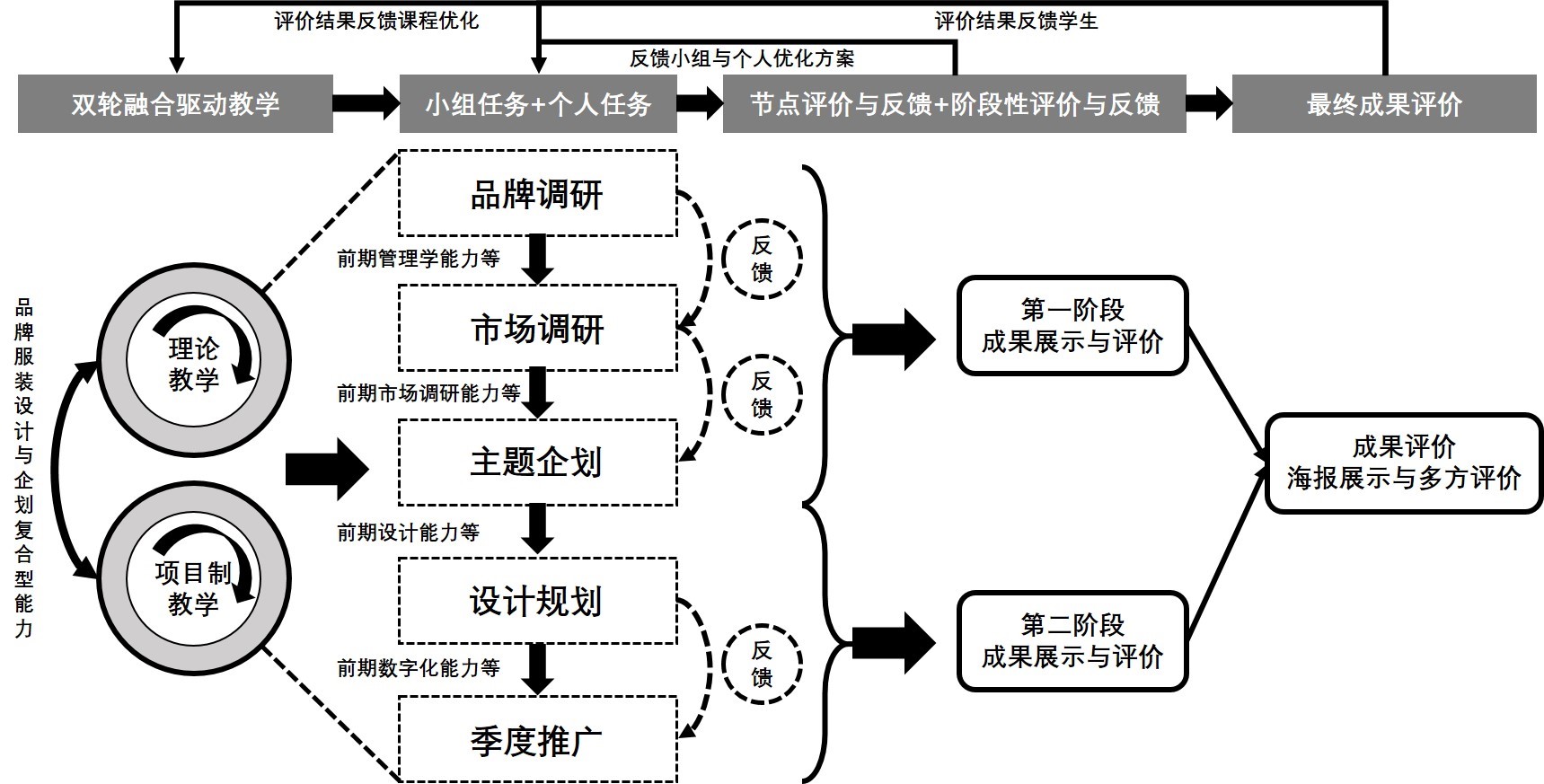 本课程以“理论教学+项目制教学”双轮融合推进的教学方式,对五大教学内容进行逐层推进式教学,该五大教学内容分别是“品牌调研”、“市场调研”、“主题企划”、“设计规划”与“季度推广”。通过上述五部分的教学,以达成五方面的目标:1)了解服装品牌产品开发的相关概念及运作,能够针对品牌服装设计与企划做品牌调研;2)培养学生服装品牌产品企划的能力,能够运用所学课程专业知识及方法进行主题企划与产品架构企划;3)培养学生服装品牌成衣的设计能力,能够基于品牌定位,从市场角度出发,进行成衣的设计,熟练掌握服装成衣系列效果图与款式图的电脑表现方法;4)培养学生服装品牌产品推广的能力,能够根据产品上市波段制定季度总体方案以及促销活动方案;5)培养学生服装品牌产品企划方案的制作和演示的能力。