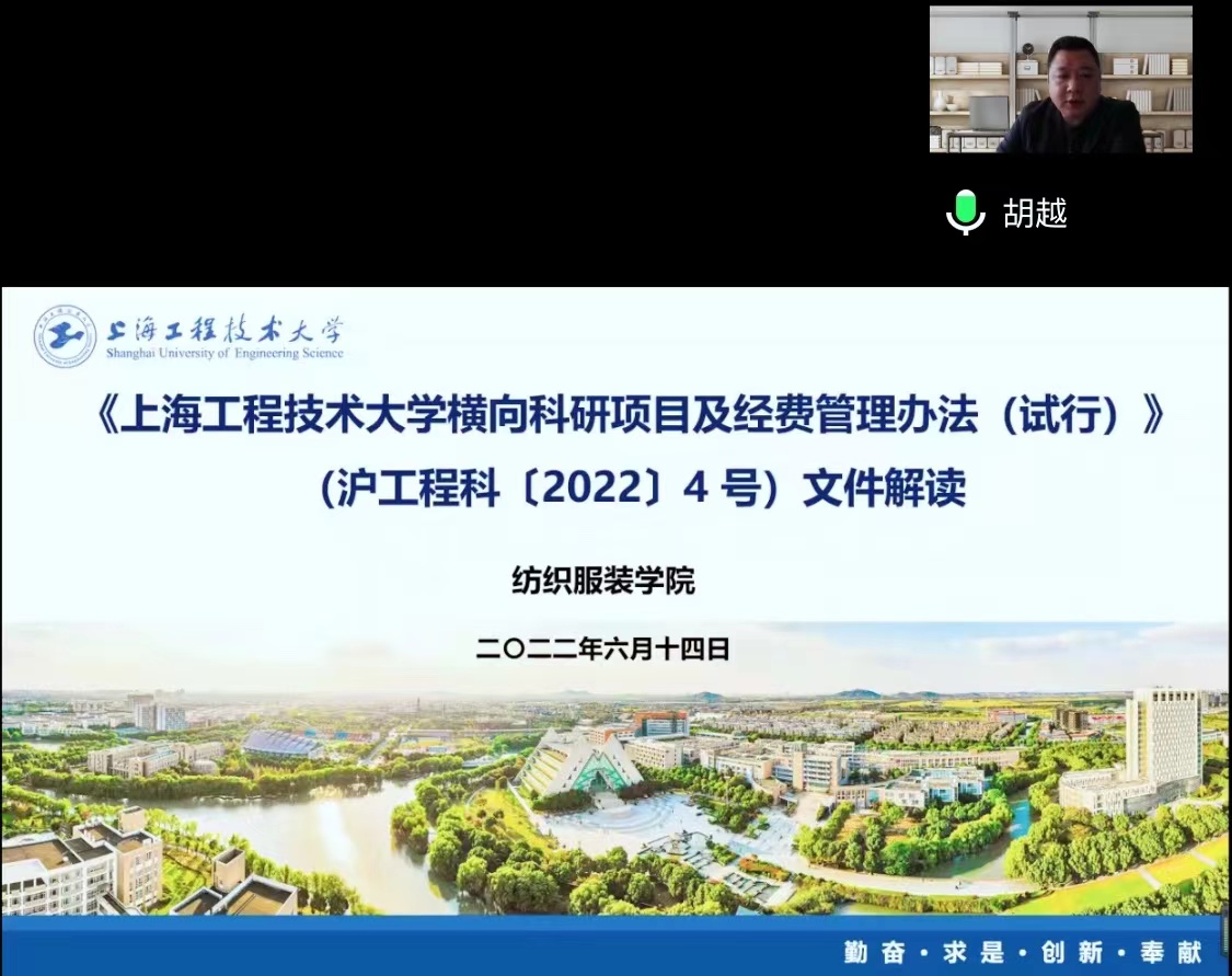 为进一步贯彻《9728太阳集团横向科研项目及经费管理办法(试行)》相关精神,激发学院教师积极申报横向科研项目的热情,6月14号下午,太阳成集团tyc9728组织学院教师进行横向科研项目管理办法线上宣讲会,以推进学院学科与科研的发展,会议由太阳成集团tyc9728科研副院长胡越教授主持。