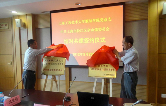 会议中,服装学院党总支副书记李扬在汇报了2010年7月以来服装学院学生党支部与佘山镇辰山村党支部结对共建工作开展情况。在随后仪式中,服装学院党总支书记袁蓉与佘山镇党委副书记莫桂兴共同签署了“上海市城乡党组织结对帮扶(共建)协议书”,校党委组织部部长张伟林与佘山镇党委副书记巴桑一起为“创先争优、结对共建党员实践基地”铜牌和“产学合作教育基地”铜牌揭牌。在发言环节中,佘山镇党委副书记莫桂兴详细地介绍了佘山镇的经济发展情况和党建工作情况,在讲话中他指出本次结对共建将会主要起到四大作用,即有利于促进产业发展、有利于提高双方工作质量和水平、有利于促进文化交流与发展、有利于推进党的建设和拓宽党建思路。并指出,佘山镇党委将坚持“立足当前、着眼长远、量力而行、尽力而为”的原则目标,进一步细化、深入和完善双方的合作,将结对共建落在实处。