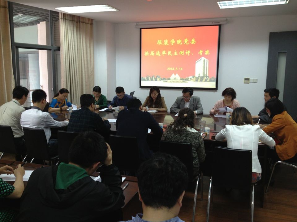 5月14日下午15:00,由校纪委徐国祥、梅运笋、组织部赵雷、党办万慧琳组成的校党委考察组莅临服装学院,对服装学院党委书记、副书记进行2014年换届选举民主测评、考察。服装学院、中法埃菲时装设计师学院党政领导班子、各系室主任、党支部书记和全体辅导员参加此次会议,会议由校党委考察组组长徐国祥老师主持。