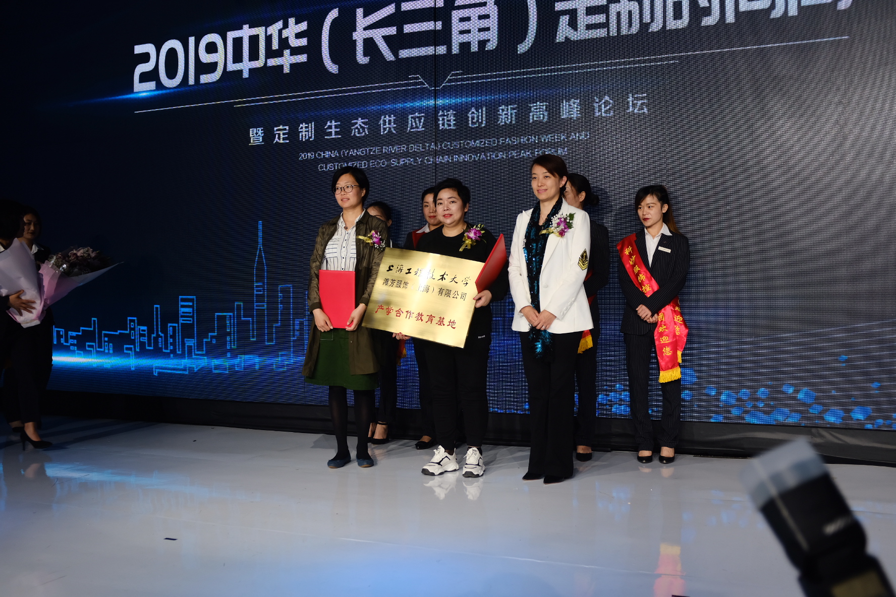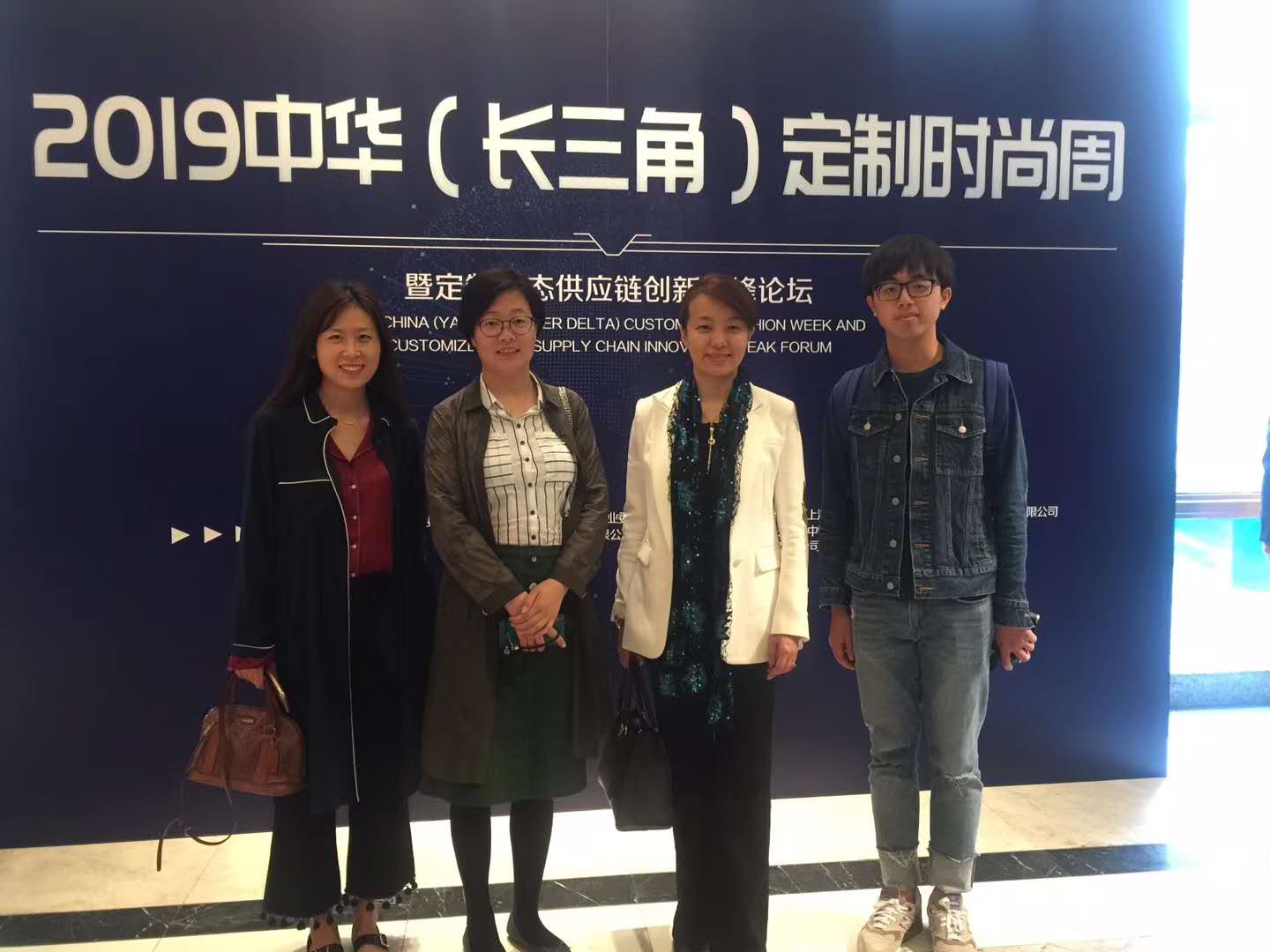 滩芳服饰(上海)有限公司与服装学院产学合作教育基地签约仪式作为时尚定制周的一项重要议程,服装学院党委书记袁蓉、党委副书记谢志霞,滩芳服饰(上海)有限公司董事长朱玉芳共同为产学合作教育基地签约揭牌。