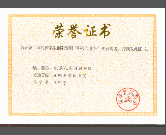 在刚刚结束的第二十届上海高校学生创造发明“科创杯”大赛中,服装学院共有3个项目争得荣誉,其中由纺织工程系刘晓霞教授指导、庄明宇同学带领的“机器人防护服”项目团队本次大赛中荣获发明创新创业奖(市一等)和发明创新三等奖(市三等);纺织化学染整专业朱同贺同学带领的“静电纺乳酸基载药纳米防粘连膜的的制备与开发”项目团队获发明创新二等奖(市二等);纺织工程系薛亚静同学带领的“低速冲击测试仪”项目团队获发明创新三等奖(市三等),为服装学院争得荣誉。