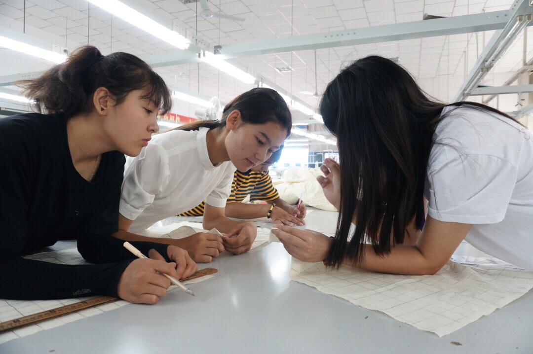 通过调研,成员们了解到目前厂区工人们主要是当地的维吾尔族妇女,知识水平有限,汉语水平不高,需要兼顾务农与生产工作,均是从零开始经过一段时间培训合格后进厂工作,目前主要承担的工作仅是简单的成衣加工。因此,暑期实践团成员们纷纷建议公司在今后应将功能产业用纺织品作为发展方向,提高公司产品附加值。