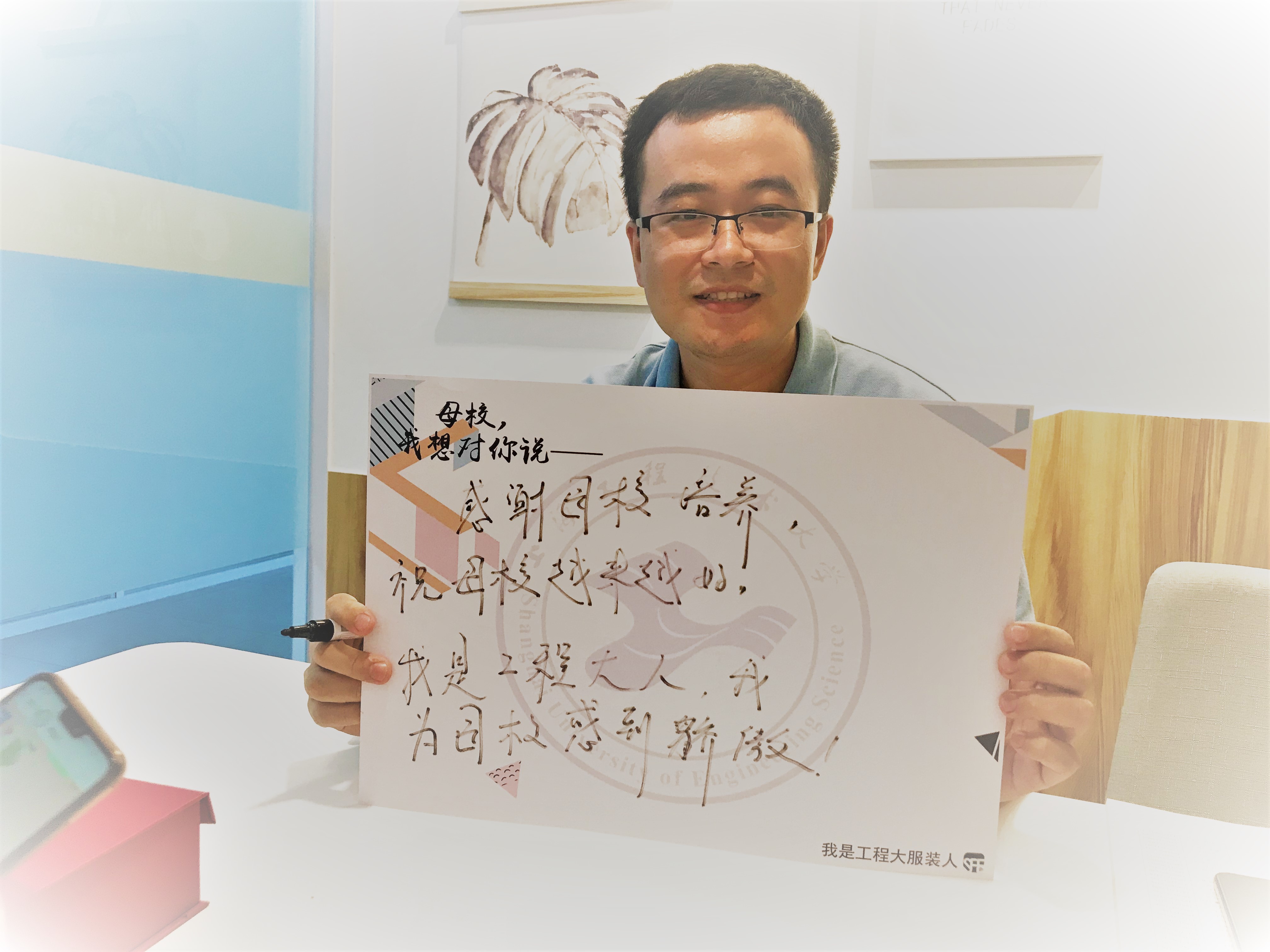 最后,陈春敏校友在校友留念板上写道:“感谢母校培养,祝母校越办越好,我是工程大人,为母校感到骄傲。”