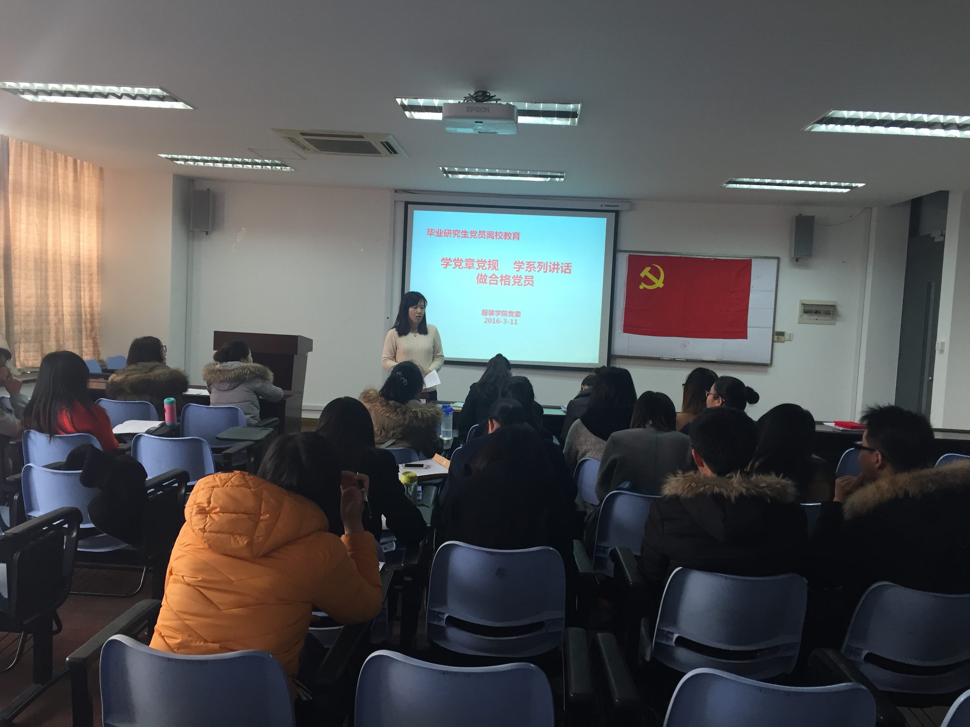 为加强毕业研究生党员的党性修养、思想觉悟以及社会责任感,发挥党员先锋模范作用,3月11日下午14:30,服装学院党委在艺术楼A215开展以“学党章党规,学系列讲话,做合格党员”为主题的2016届毕业生党员集中党性教育。学院党委组织员郑艳以及全体服装学院毕业研究生党员出席会议。