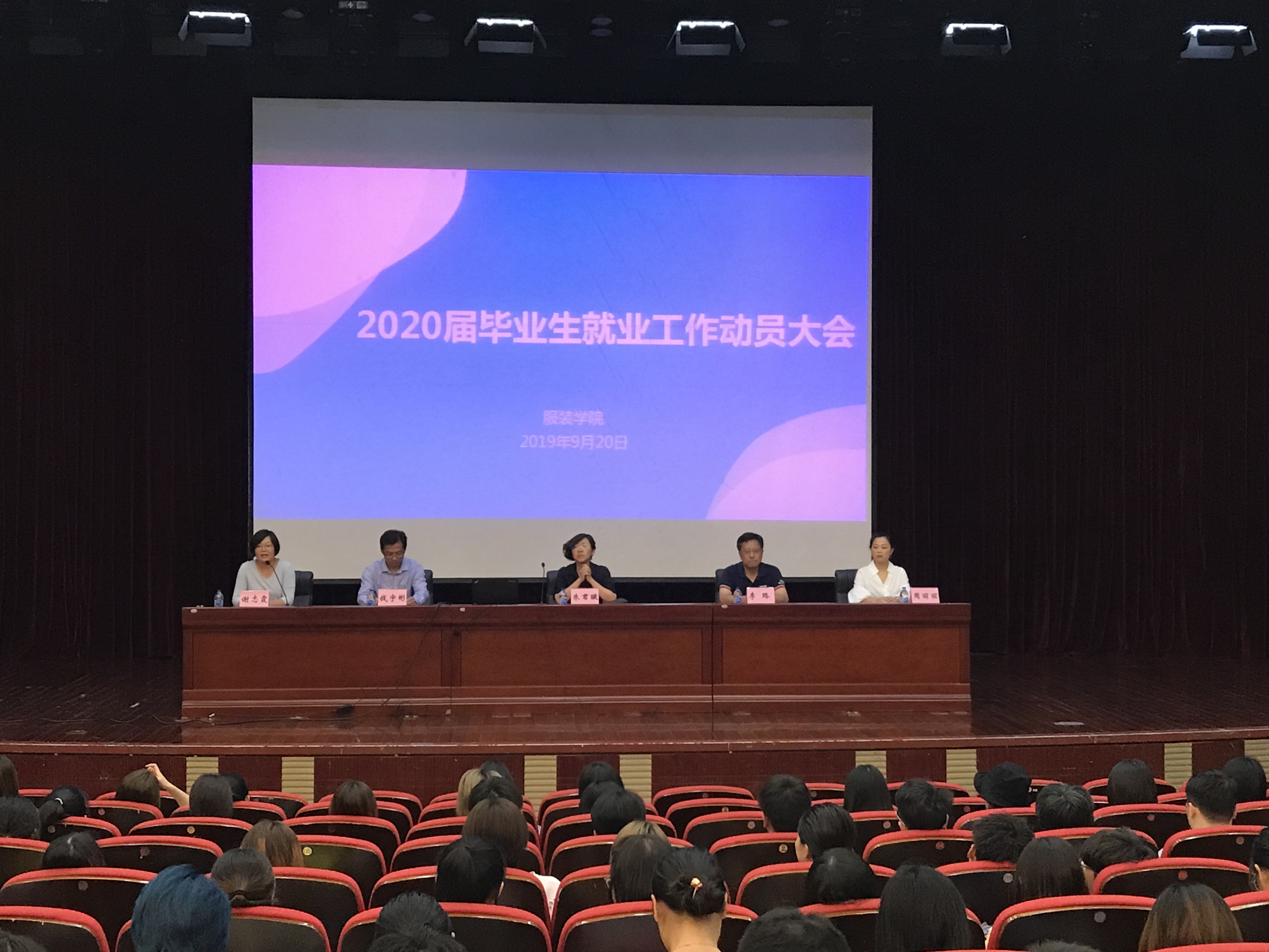 为进一步帮助毕业生明确就业方向和形势,推动2020届毕业生就业工作稳步前进,提高同学们就业热情,了解就业形势,明确就业方向,2019年9月20日下午,服装学院在志宏堂举办了2020届毕业生就业工作动员大会。服装学院党委书记朱君璇、研究生处副处长李路、产业办副主任钱宇彬、服装学院党委副书记谢志霞、上海凌皓服饰有限公司总经理周丽丽、服装学院学办主任沈智莉、辅导员孙琴、董海宇、杨慧舜以及2020届全体毕业生参加了此次会议。会议由服装学院党委副书记谢志霞主持。