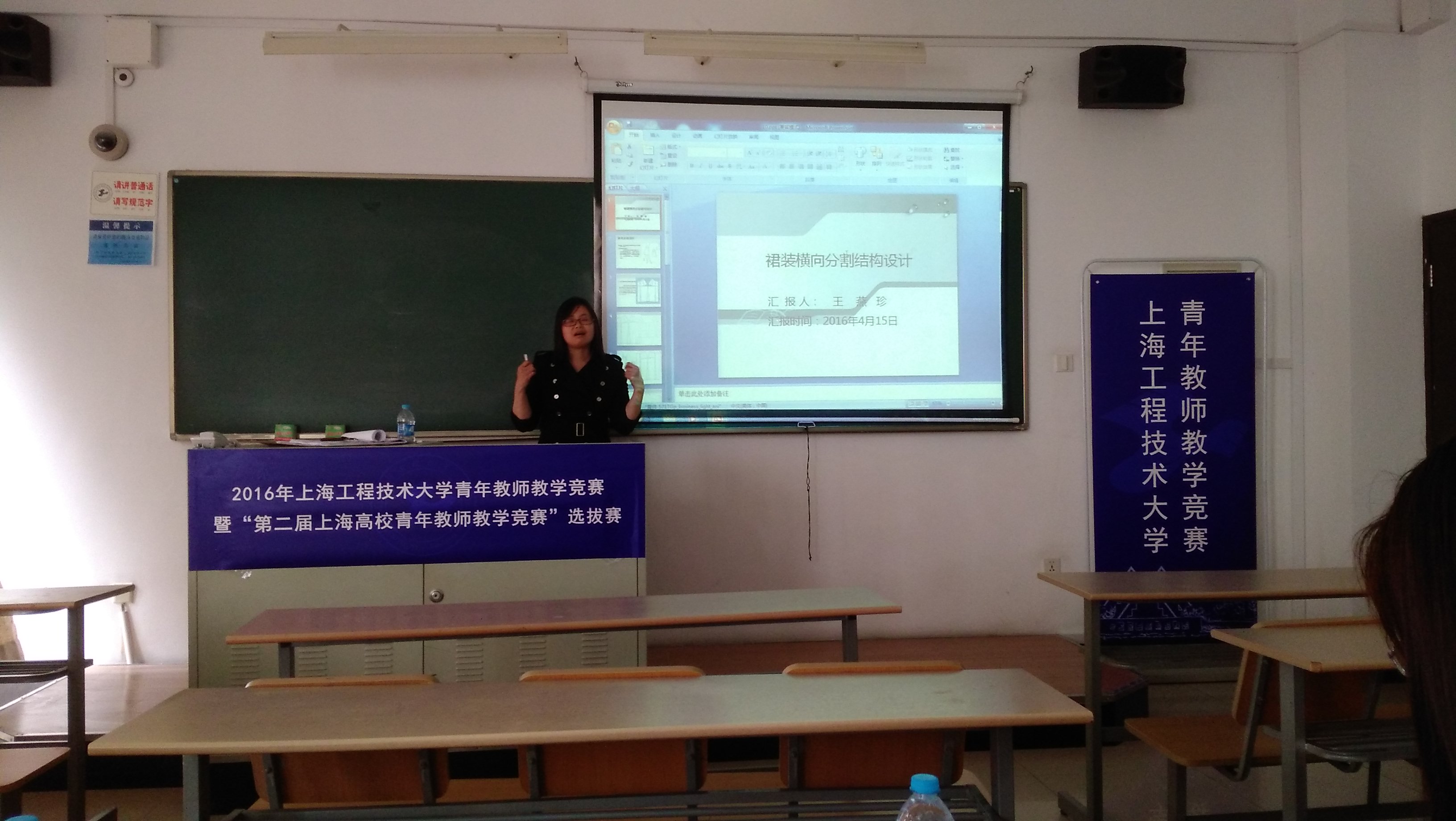 2016年4月15日下午,由校工会、教务处、人事处等联合举办主题为“共筑程园梦·讲台建新功”的2016年校青年教师教学竞赛暨我校青年教师参加第二届上海高校青年教师教学竞赛的选拔赛在教学楼举行,服装学院选派了胡筱、孙琰、刘玮、刘若琳、王燕珍等五位青年教师骨干代表参加了竞赛,其中胡筱、孙琰二人参加了社会科学组的教学竞赛;刘玮、刘若琳、王燕珍三人参加了自然科学应用学科的教学竞赛。