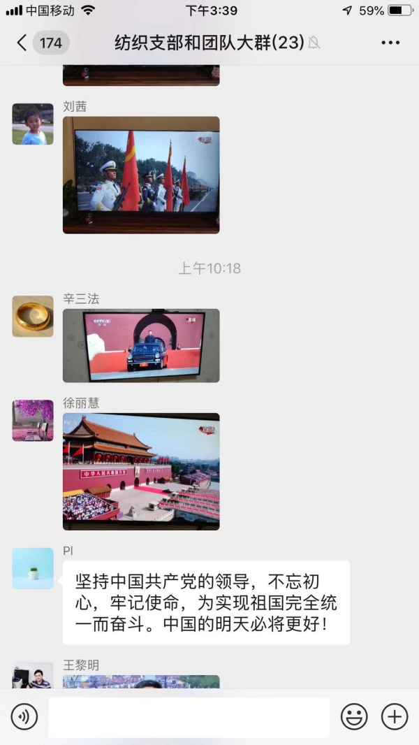 2019年10月1日上午10点,服装学院纺织工程党支部组织全体党员在家观看了庆祝祖国70周年华诞阅兵式,并在支部微信群进行了交流。
