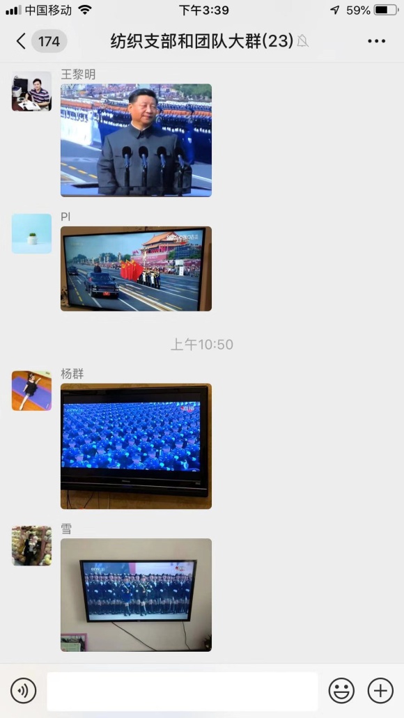 杨群老师在群里发表了“70年的风霜雪雨,70年的艰苦历程,中国一步步从大国走向强国。70年的大阅兵,不仅让我们铭记历史,牢记使命,更是一个让世界各国了解中国、展示我国实力的舞台!加油,中国!”的感言。