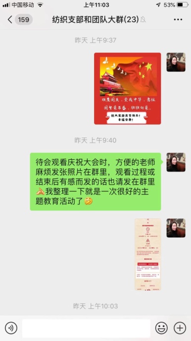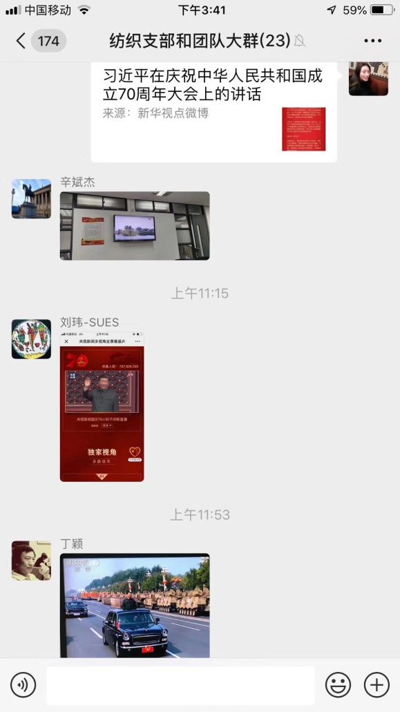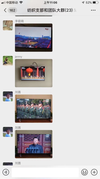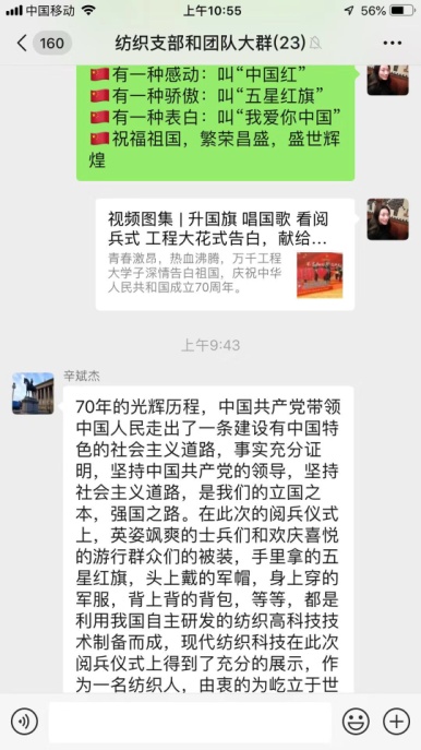 2019年10月1日上午10点,服装学院纺织工程党支部组织全体党员在家观看了庆祝祖国70周年华诞阅兵式,并在支部微信群进行了交流。