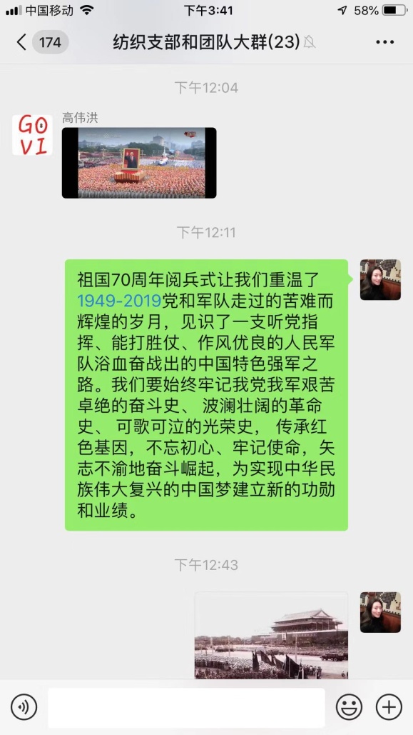 杨群老师在群里发表了“70年的风霜雪雨,70年的艰苦历程,中国一步步从大国走向强国。70年的大阅兵,不仅让我们铭记历史,牢记使命,更是一个让世界各国了解中国、展示我国实力的舞台!加油,中国!”的感言。