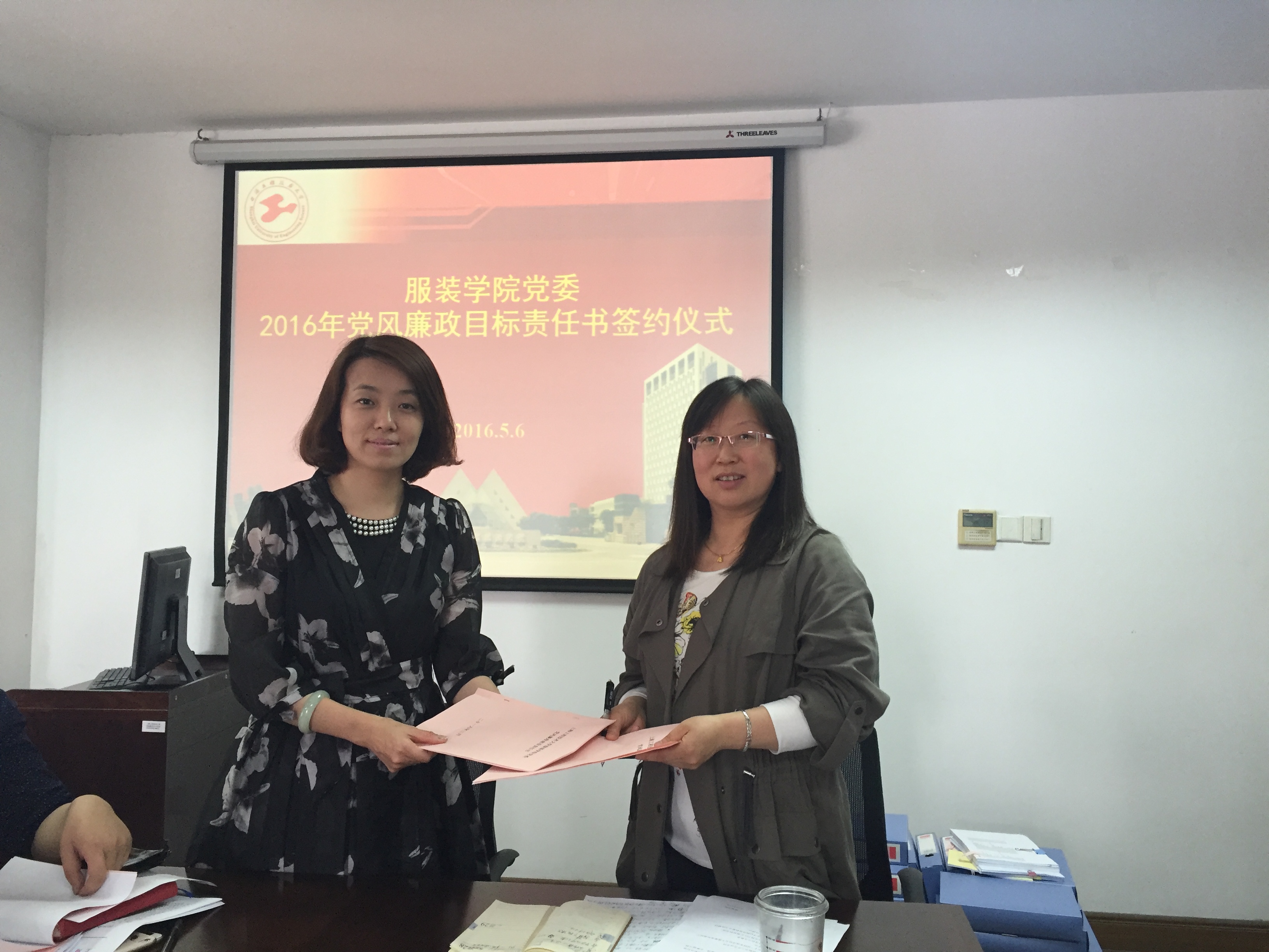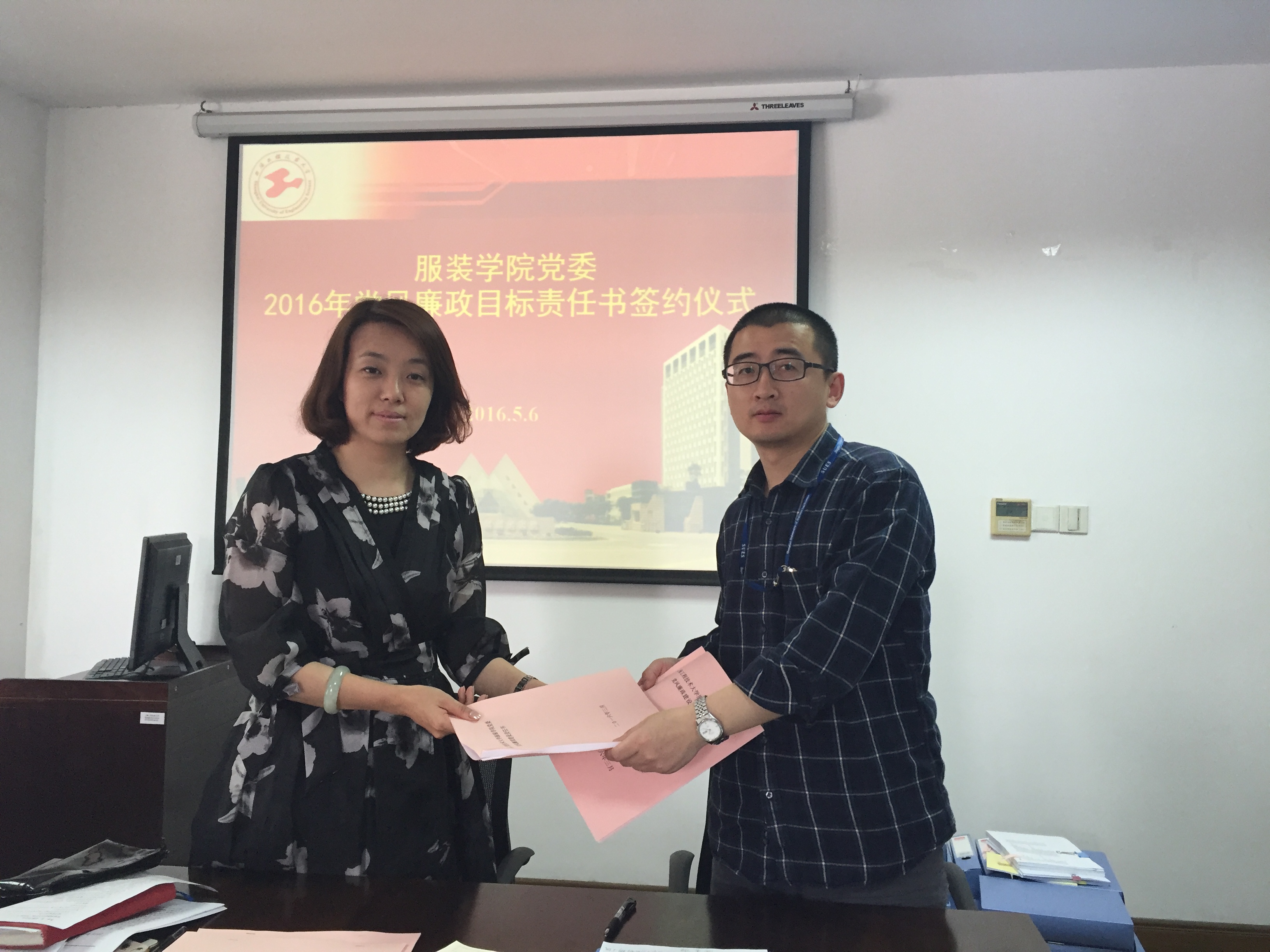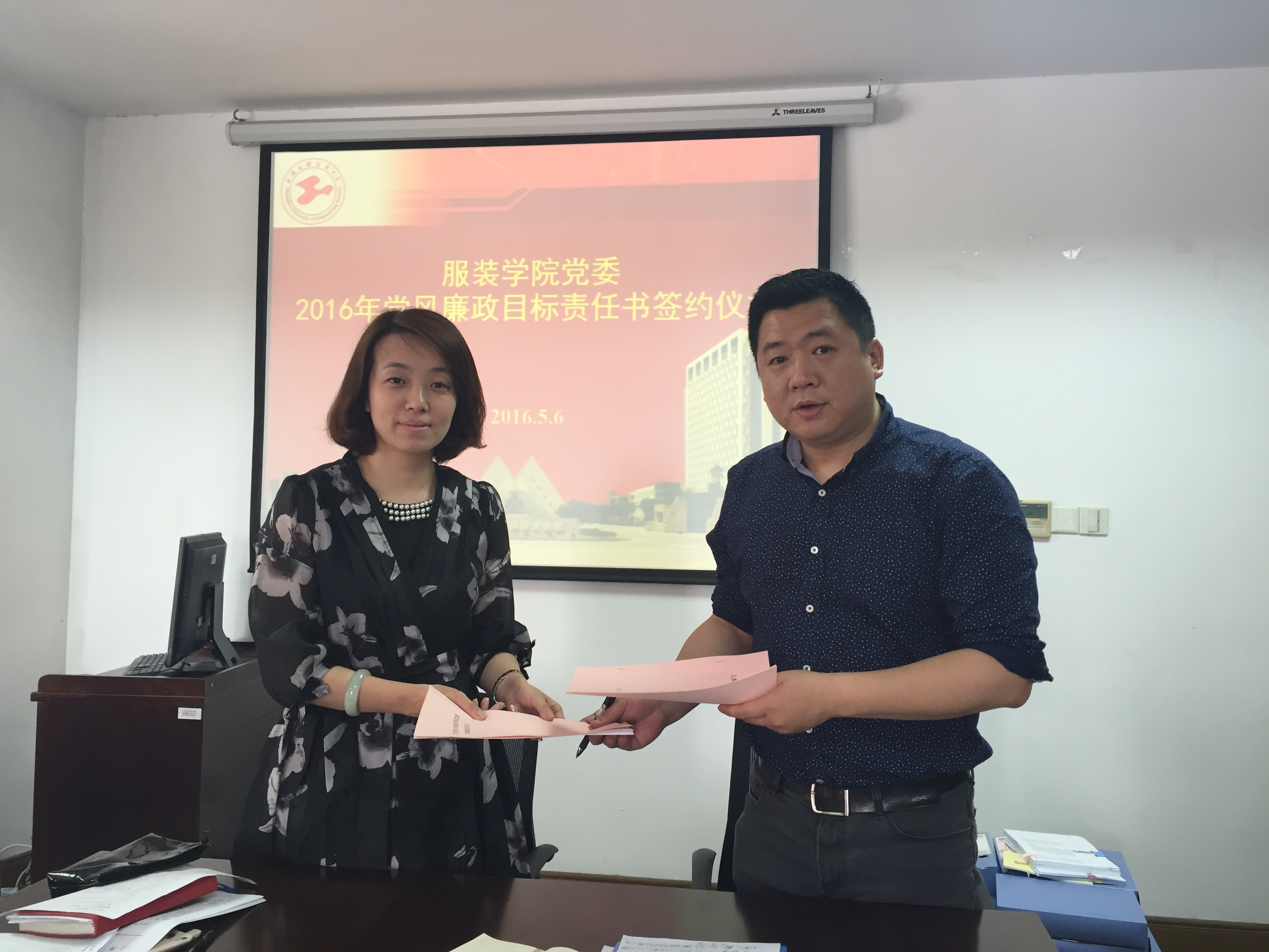 5月6日下午,服装学院党委“2016年度党风廉政建设目标责任书签约” 仪式在艺术楼A218会议室召开。会议由党委书记袁蓉同志主持,全体中层干部及系(室)主任、支部书记出席了会议。