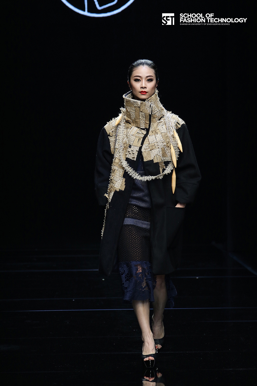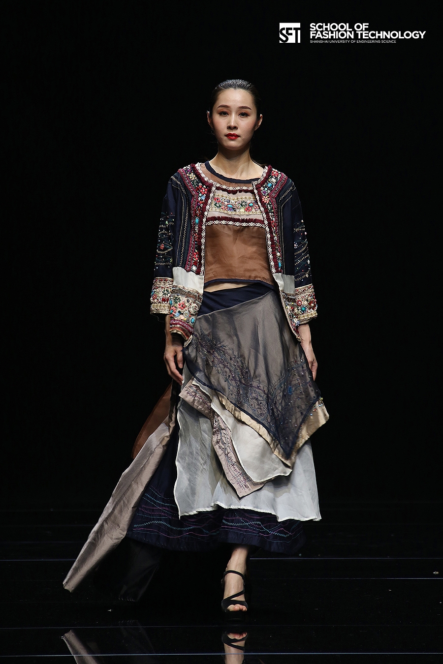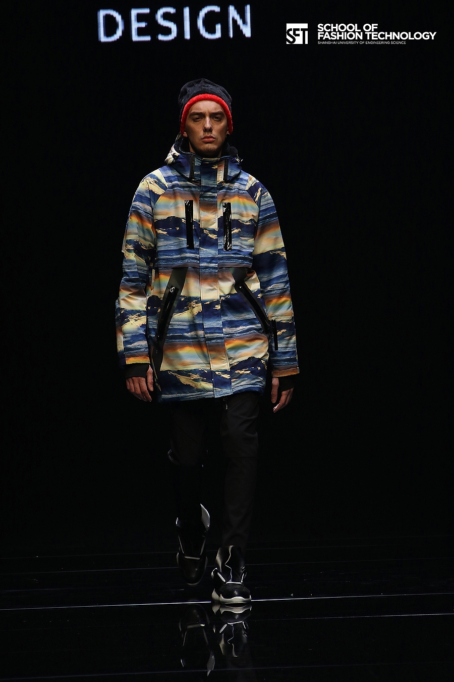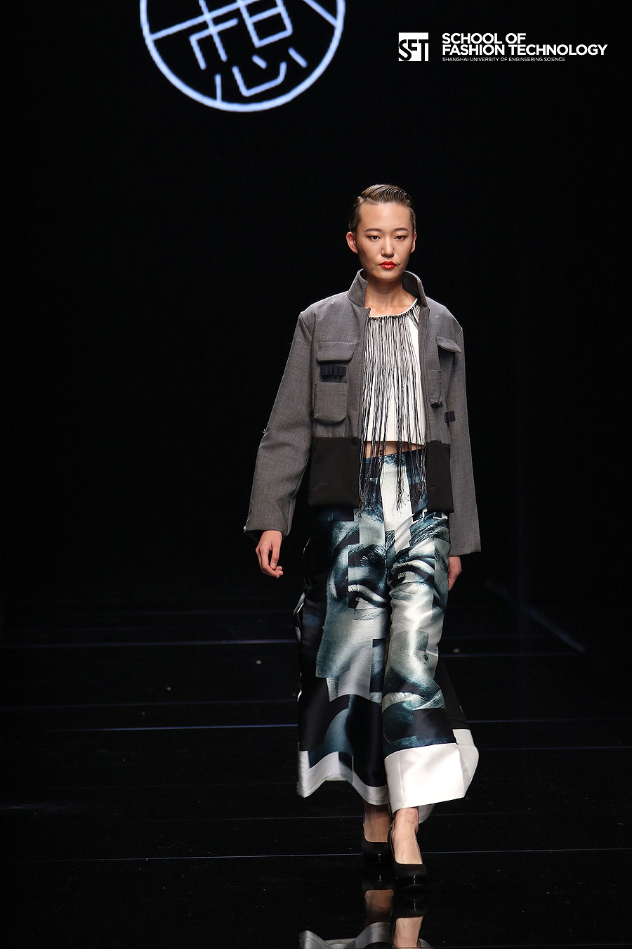 本次发布的作品体现了服装学院师生对设计的充满想象力的理解,大廓型拼接的外套与内衣的混搭极具视觉冲击力,水墨图案的数码打印花面料表现了科技感,体现了成熟的制作水准。