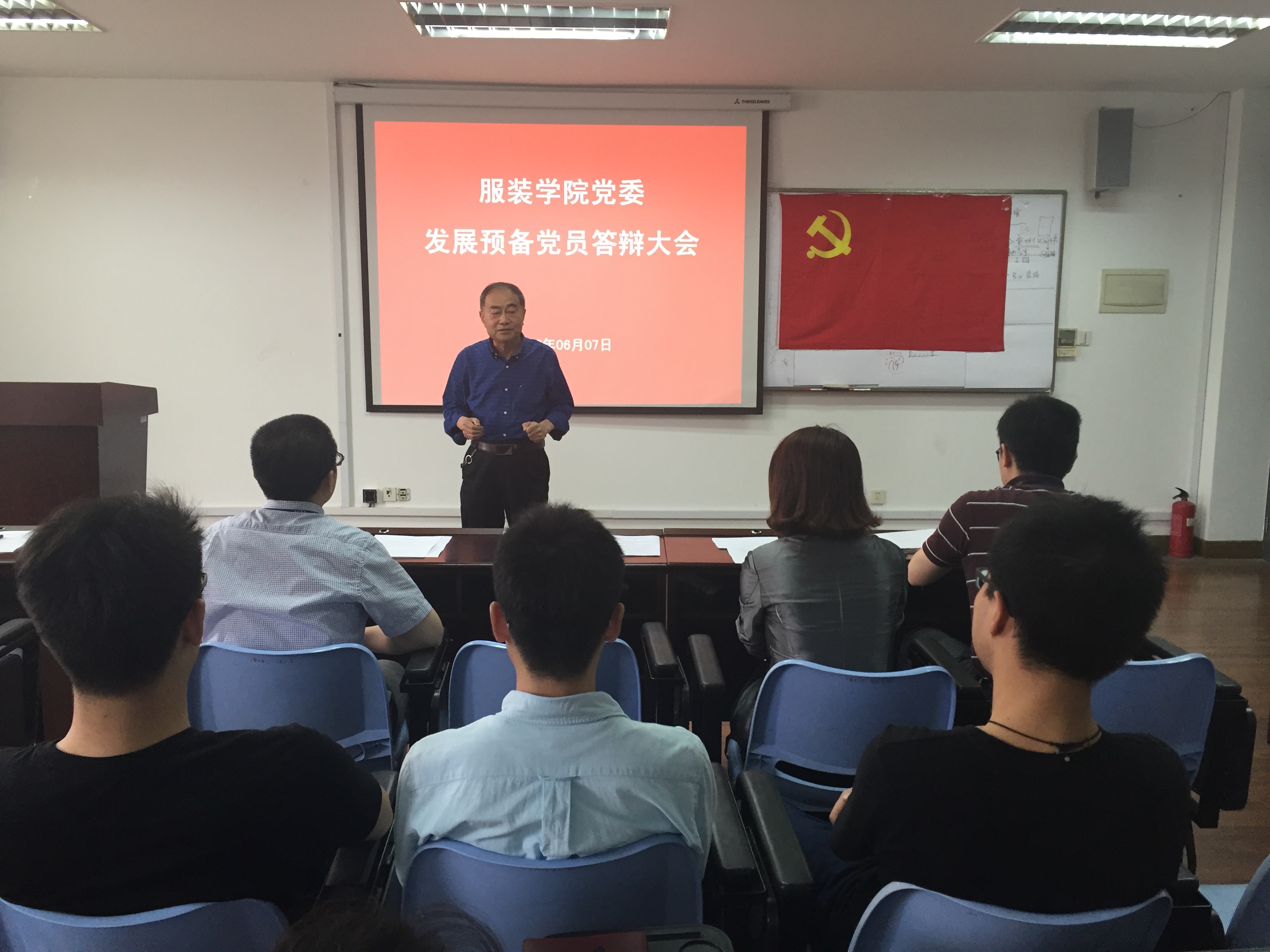 2016年6月7日下午12:30,为贯彻“两学一做”要求,服装学院党委在艺术楼A215召开研究生第一党支部发展党员答辩大会。校关工委特邀组织员吴德林、服装学院党委书记袁蓉、副书记李杨、校党委组织部朱良博、材料工程学院党委组织员阮晓栋、服装学院组织员郑艳以及研究生第一党支部全体党员、积极分子代表、群众代表参与了此次答辩大会。