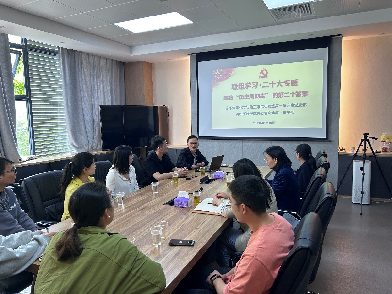 在学习会上,学院研究生第一党支部书记对我院研究生党支部进行了介绍,并宣布本次联建共建围绕“学思想、强党性、重实践、建新功”中的“学思想、强党性”展开。主要领学了党的二十大报告中关于党的自我革命部分内容、“百年党史最具历史意义的六次自我革命”等内容,随后观看了微视频《自我革命永远在路上》。最后,党员们围绕“作为研究生党员应该如何做”等方面积极交流并发表感想。