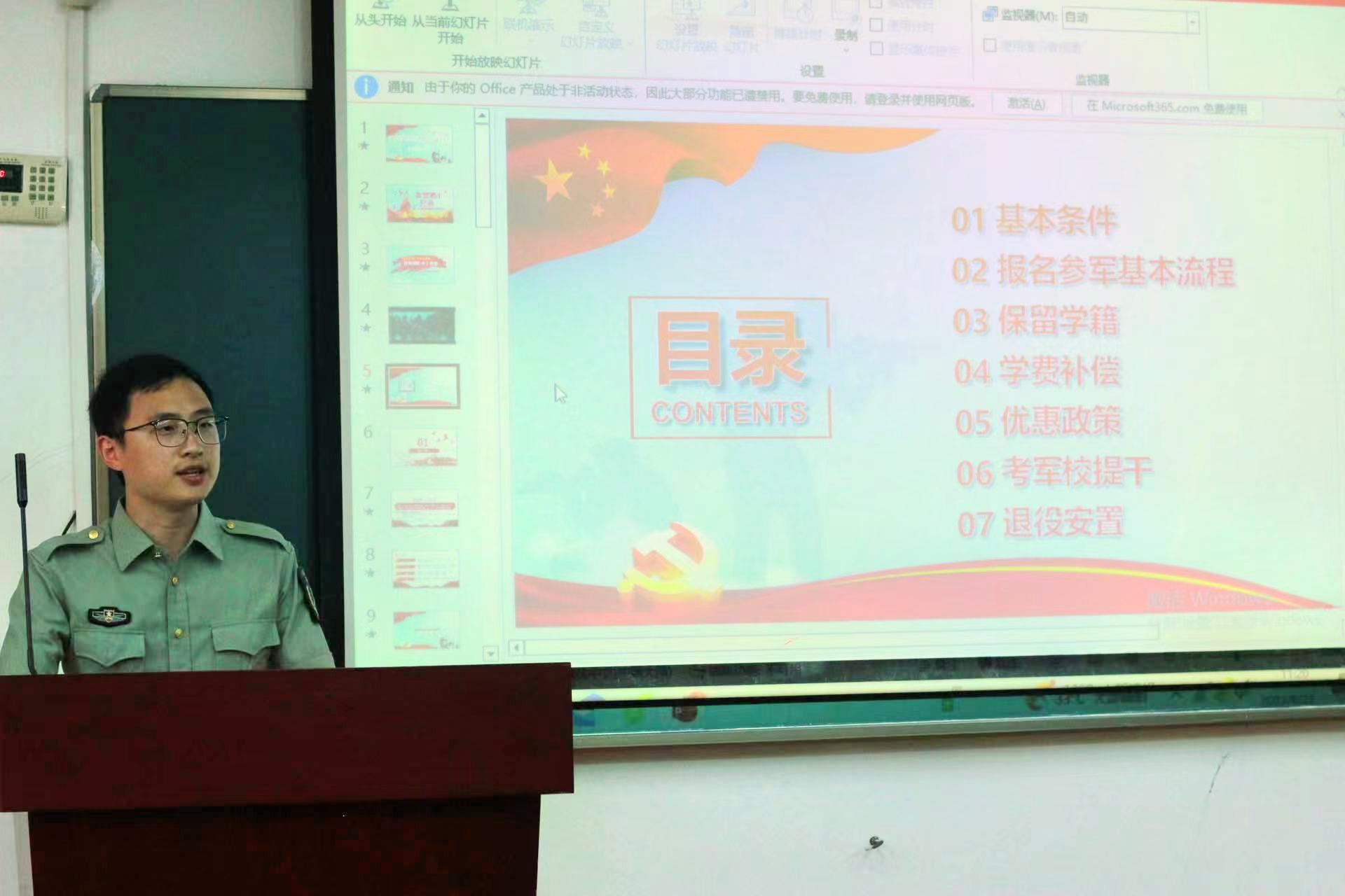分享会上,辅导员李永贺首先强调了军训和征兵工作的必要性和重要性,并讲述了国防的意义,他提到保家卫国、抵抗侵略是中华人民共和国每一个公民的神圣职责,依照法律服兵役是中华人民共和国公民的光荣义务。接下来,李永贺老师详细介绍了参军入伍的相关政策、要求、条件,并对升学考学、就业上岗、考公考编、自由创业等多项优惠政策进行了解读,最后介绍了参军入伍的报名方法和注意事项,鼓励学生踊跃参军入伍,报效国家。