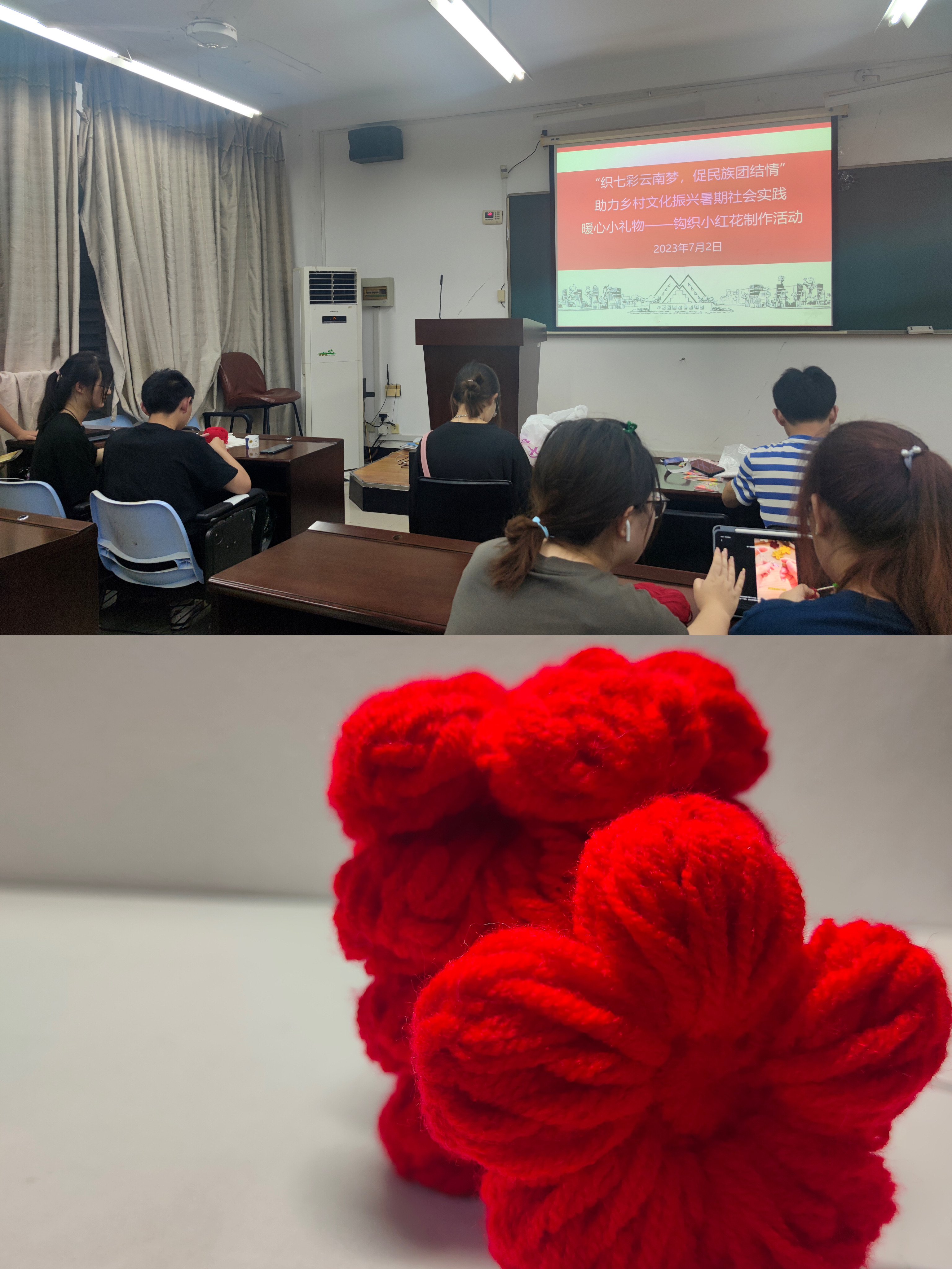 在选拔活动结束后,项目成员通过前期调研,当地彝族深谙色彩规律,善于运用对比手法,服饰中红、黄、绿、白等不同色相被大量运用,其中以红色为主。他们对色彩的熟练运用,使服饰变得生动、跳跃。针对这一显著特征,项目成员组织了一场别开生面的小红花手工钩织活动,这些小红花既是暑期社会实践的一部分,展现学院专业优势,同时也是送给云南当地乡村中小学生们的一份暖心小礼物,传递项目成员对民族团结的一份贡献。