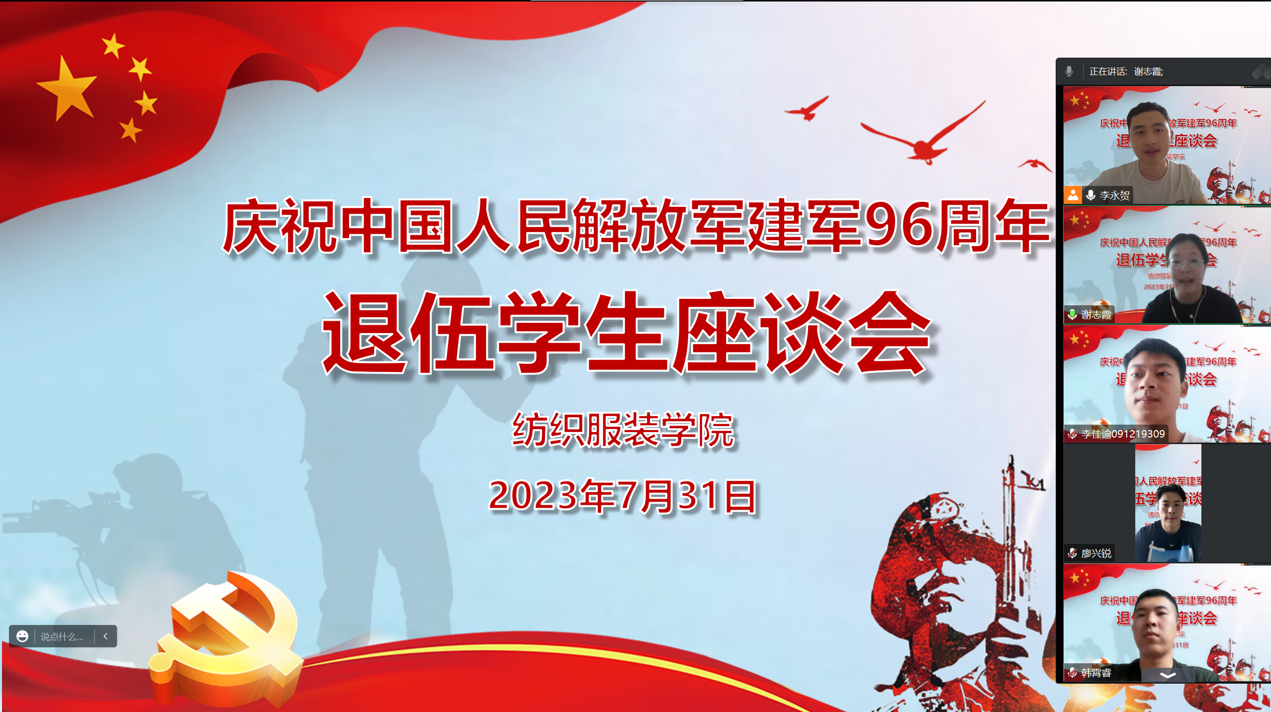当日中午,针对退伍复学学生召开了“退伍学生座谈会”,学院党委副书记谢志霞对各位同学传达了节日祝福,同时对同学们能够积极响应国家号召,献身国防表示感谢。座谈会上,退伍学生们逐一畅谈了他们复学后的思想、学习和生活情况,学院及时关注同学们假期的规划并帮助他们解决学习生活中的实际困难。学院党委副书记谢志霞表示,希望同学们继续保持军队的优良传统和军人品格,退役不退志,退伍不褪色;同时,不忘初心,筑牢理想信念,回归学生本位,刻苦学习,用真才实学实现价值,服务社会。