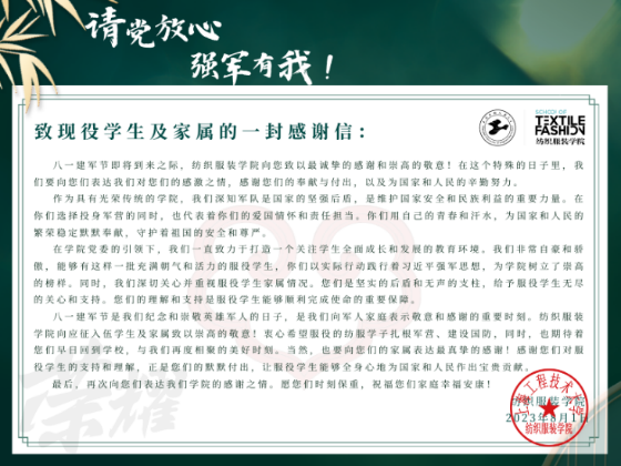 太阳成集团tyc9728党委一直以来高度重视国防教育工作,遵循“征集好入伍的、服务好在伍的、安置好退伍的”的工作要求,积极开展学院拥军优属活动,希望未来有更多的纺服学子能够从学校走进军营,在部队的舞台上施展才华,在军营大熔炉里淬炼成钢,让青春在党和人民最需要的地方绽放绚丽之花。