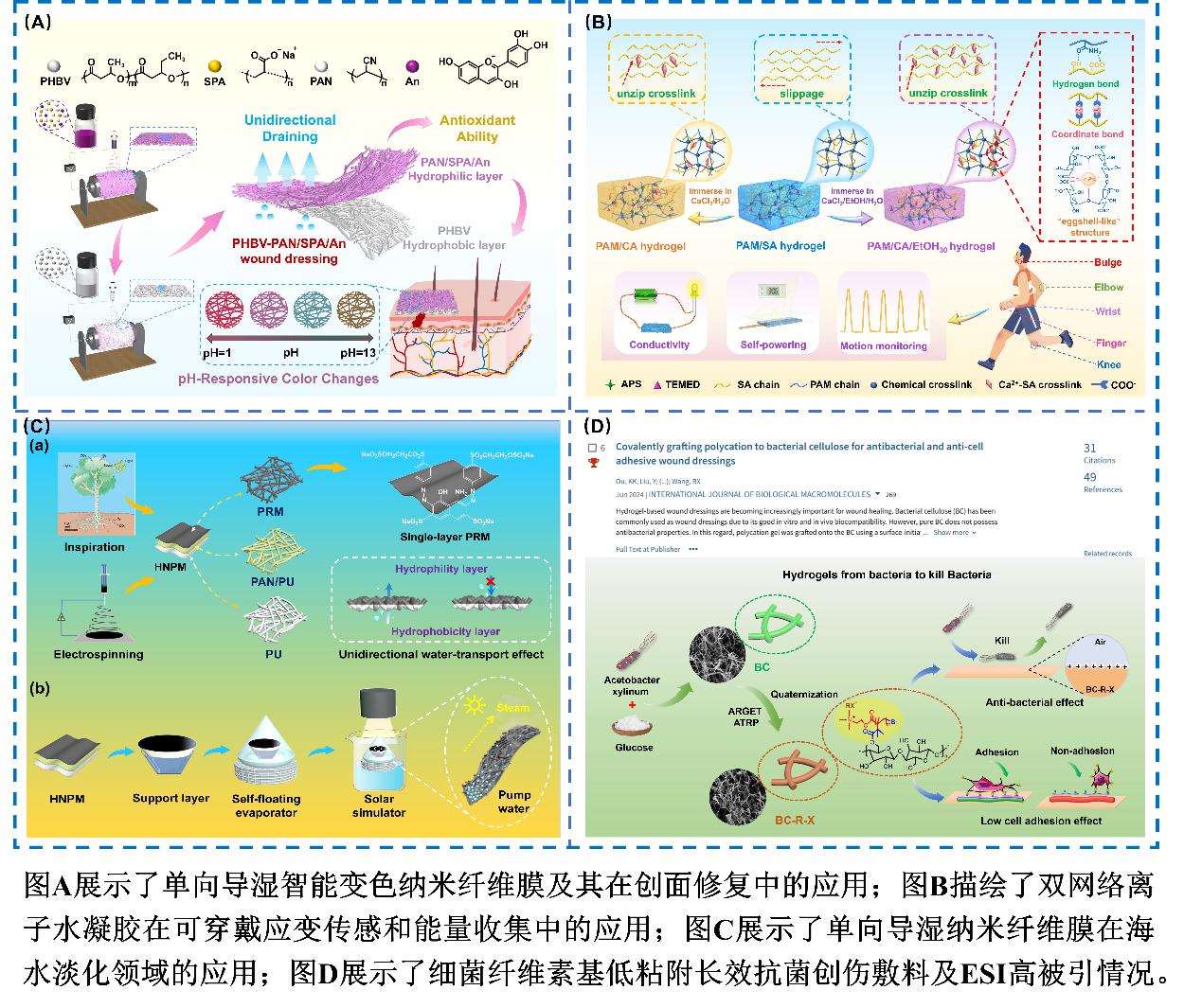 Figure A illustrates the unidirectional moisture-wicking smart color-changing nanofibrous membrane and its application in wound repair; Figure B depicts the application of double-network ionic hydrogel in wearable strain sensing and energy harvesting; Figure C shows the use of unidirectional moisture-wicking nanofibrous membrane in the field of seawater desalination; Figure D presents the bacterial cellulose-based low-adhesion long-acting antibacterial wound dressing and its ESI highly cited status.