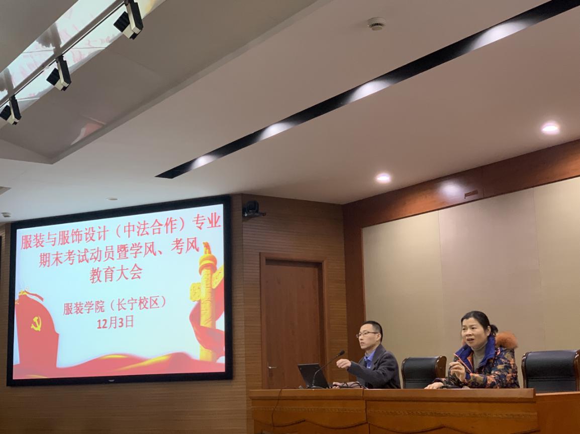 12月3日,服装学院(长宁校区)在教学楼报告厅召开期末考试动员和学风考风教育大会,服装学院党委副书记张漪、长宁校区辅导员康敏以及18级和19级在校生190余人参加大会。张漪老师和同学们现场强调了期末考试备考工作,就考风和学风问题作了纪律要求,希望同学们认真参加期末考试前的各项课程学习,积极完成任课老师布置的各项作业任务,按时上课,端正学习态度,在期末考试中严格遵守考试纪律,以实际行动维护良好的学风和考风。