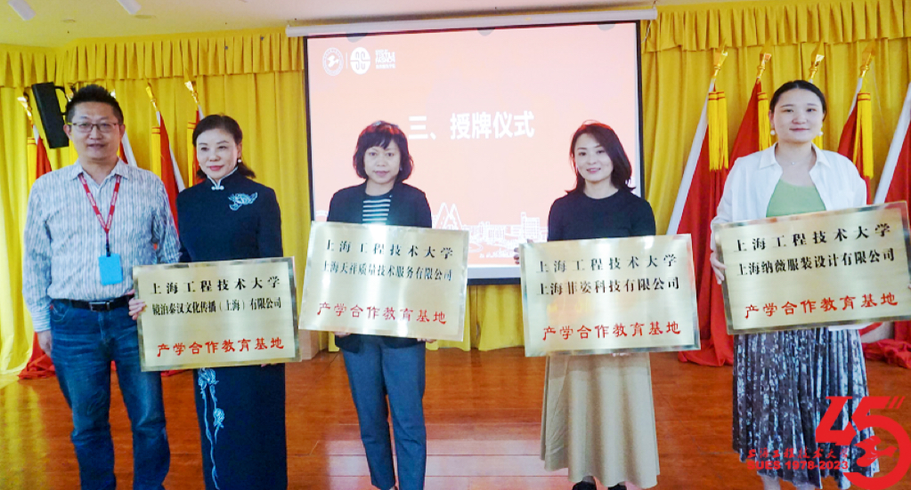 会上,学院副院长曲洪建为上海天祥质量技术服务有限公司、镜泊秦汉文化传播(上海)有限公司、上海纳薇服装设计有限公司、上海菲姿服饰有限公司授予产学合作教育基地铜牌。副院长徐丽慧为镜泊秦汉文化传播(上海)有限公司授予研究生实践基地和服装设计师数字化定制平台铜牌。副院长李春晓为上海英沐文化传媒有限公司授予校友驿站铜牌。