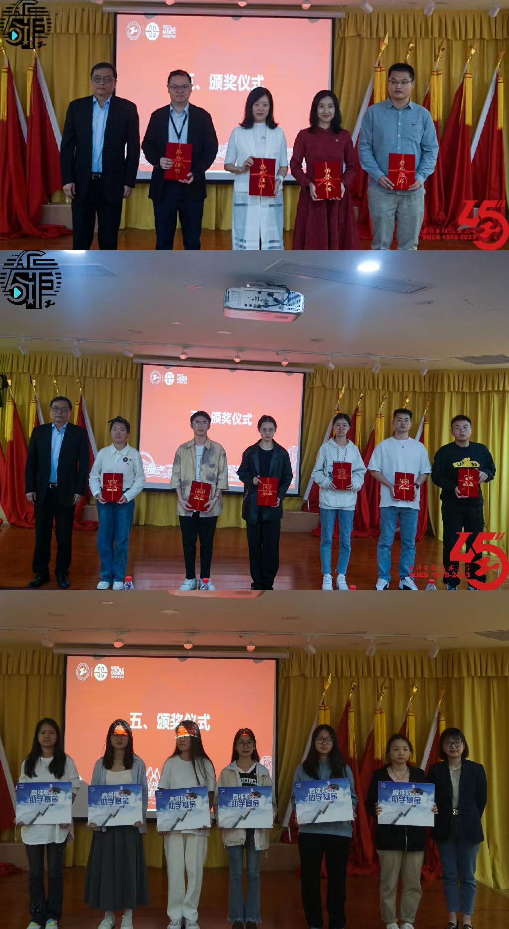 上海申达股份有限公司技术总监兼上海汽车地毯总厂有限公司总工程师龚杜弟向东方国际奖学金奖教金的获奖师生代表颁发证书。上海市青少年发展基金会副秘书长邵睿怡向真维斯助学金获奖学生代表颁发证书。筑客网络技术(上海)有限公司综合管理部副经理马辉为获奖学生代表颁发“铸人·筑梦-筑集采奖学金”、“滴水·筑梦-筑集采助学金”证书。