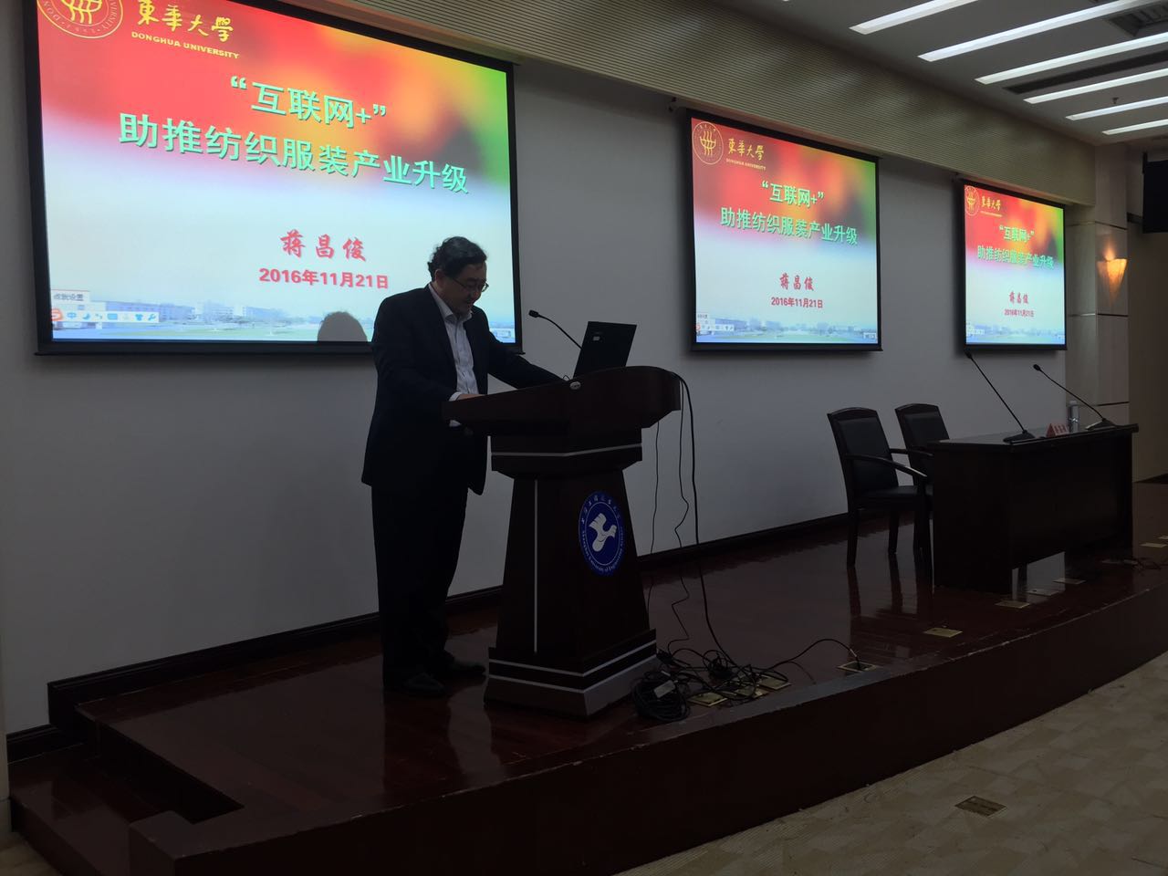 11月21日下午,东华大学校长蒋昌俊教授、博士生导师,应服装学院大师讲坛活动邀请,在图文信息中心第三报告厅展开了题为《“互联网+”助推纺织服装产业升级》的学术讲座。在讲座开始之前,校党委书记李江与蒋昌俊校长进行了简短的会面,李江书记介绍了我校的历史、布局与近期发展目标。双方就未来的合作提出了初步的设想。