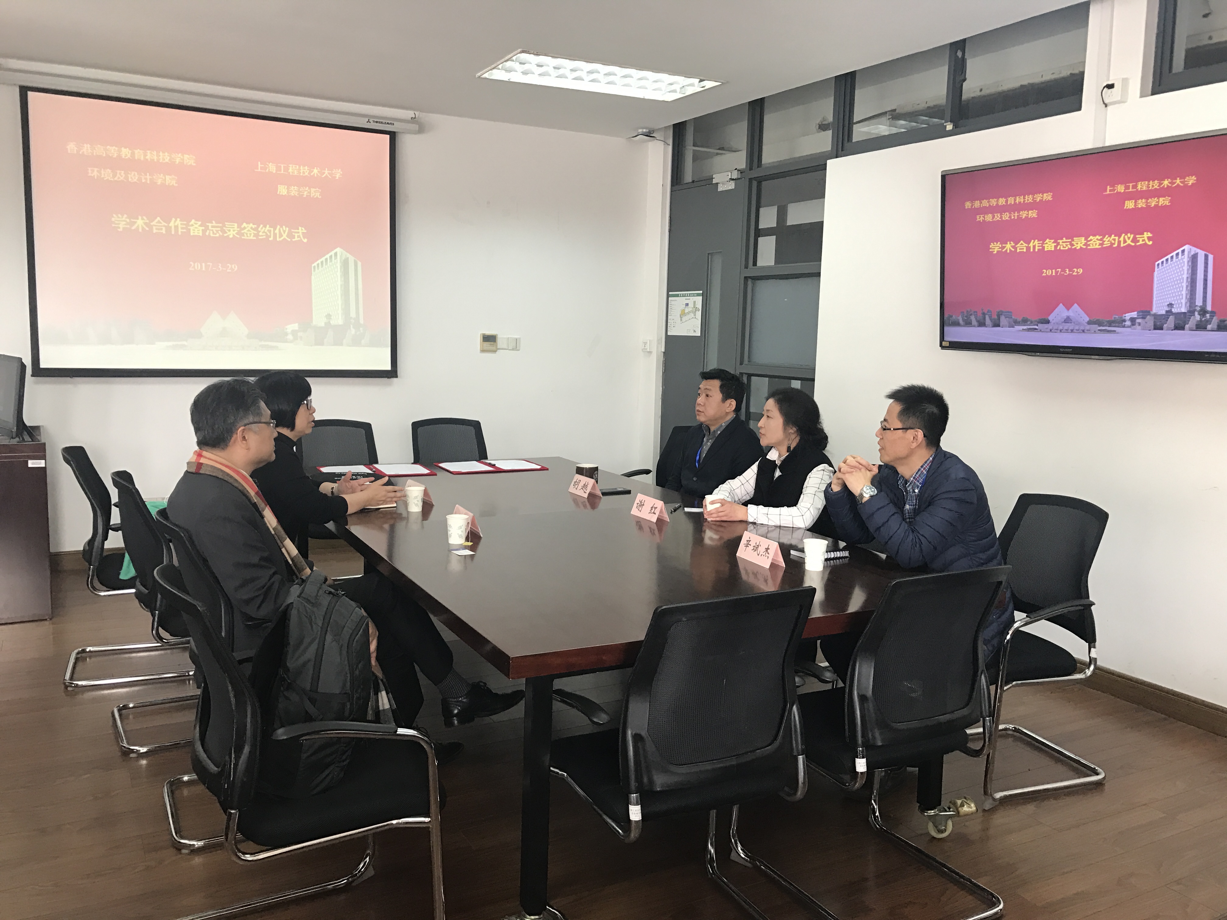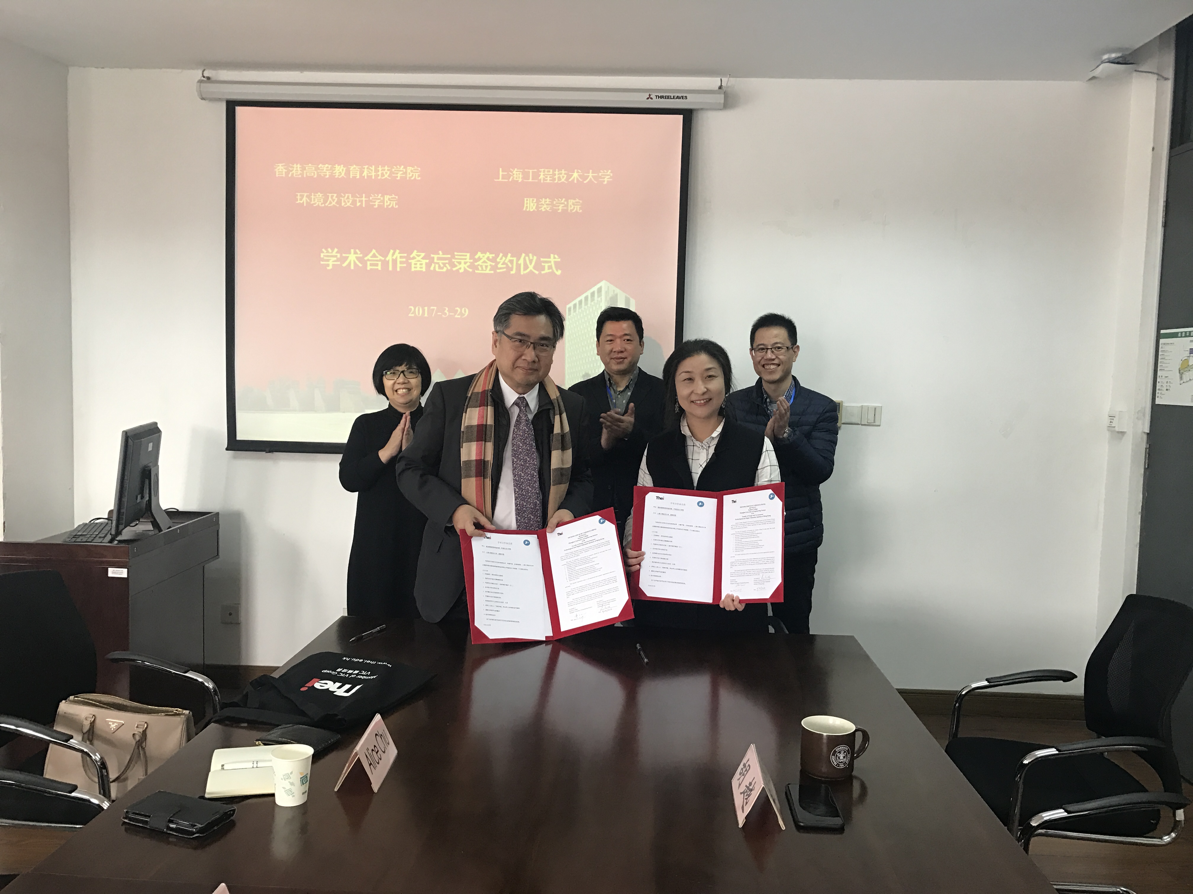 2017年3月29日,香港高等教育科技学院环境及设计学院Leslie Chen教授与 Alice Chu 副教授到访服装学院。双方还举行了学术合作备忘录签约仪式。