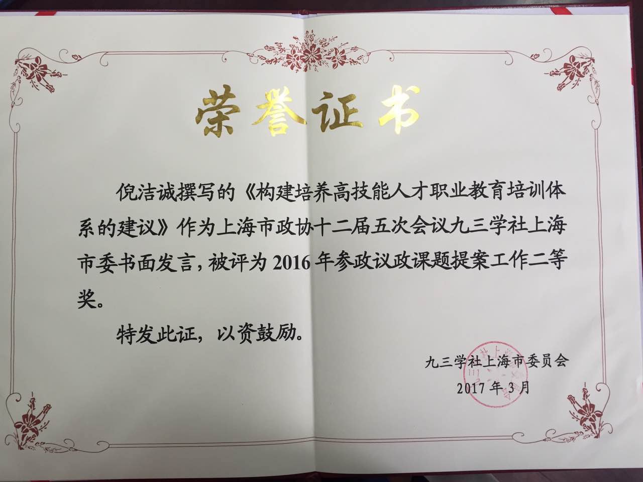 2017年4月7日,九三学社上海市委2017年度参政议政工作暨表彰会在民主党派大厦六楼多功能厅(陕西北路128号)召开。服装学院倪洁诚教师撰写的《构建培养高技能人才职业教育培训体系的建议》作为上海市政协十二届五次会议九三学社上海市委书面发言,被评为2016年参政议政课题提案工作二等奖。