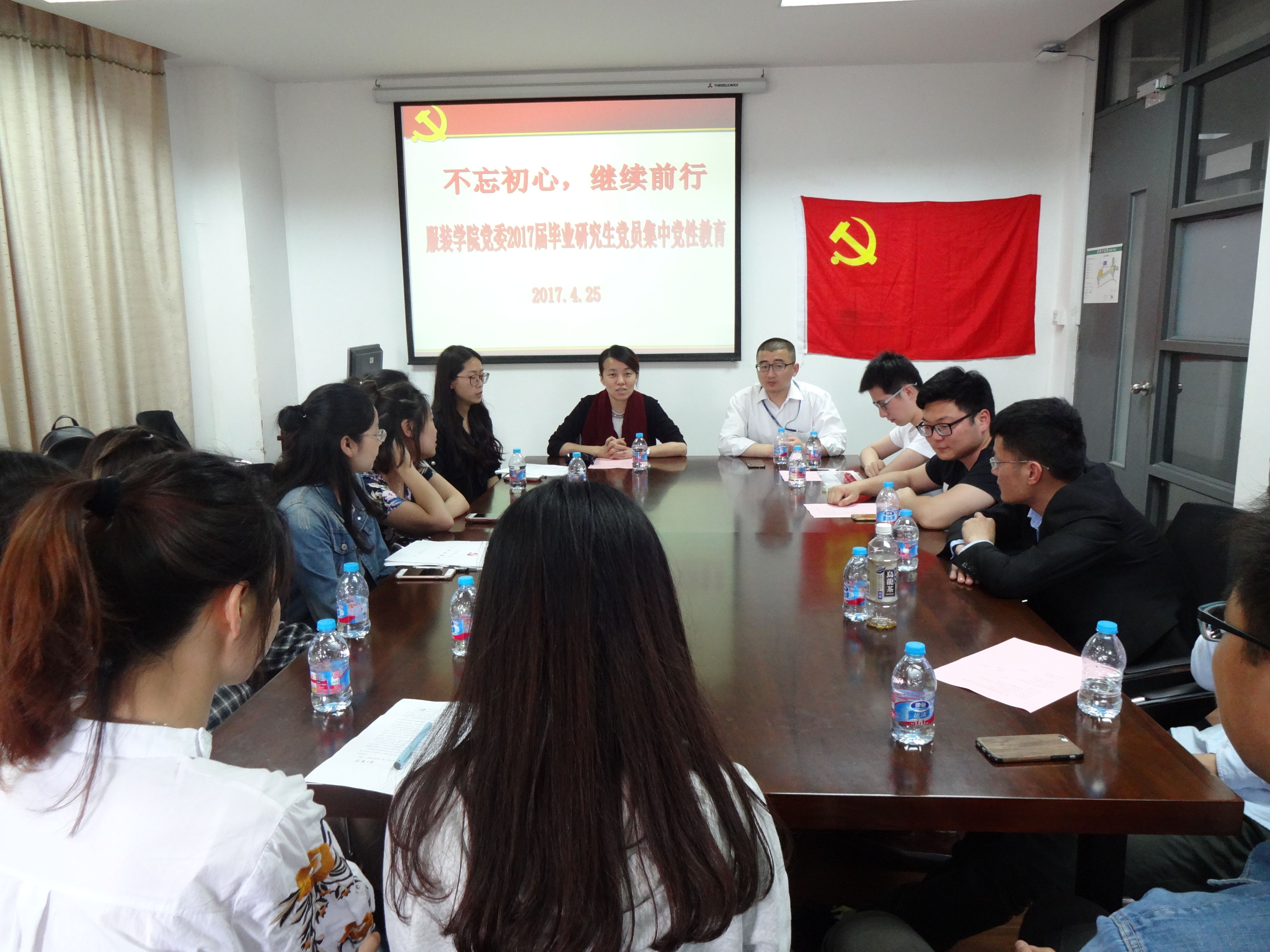 毕业生党员教育是学生党员在校期间的最后一次党性教育,为加强毕业生党员的思想教育,服装学院党委于4月25日下午在艺术楼A218开展以“不忘初心,继续前行”为主题的2017届毕业研究生党员集中党性教育。出席会议的有服装学院党委书记袁蓉、副书记李扬、组织员苌欣以及全体毕业研究生党员。